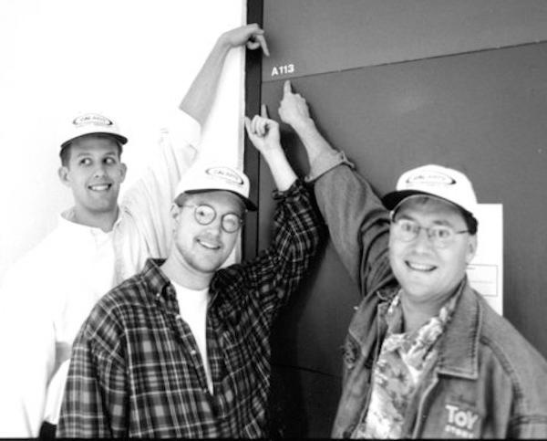 Мозговой центр: выдающиеся выпускники Калифорнийского института искусств (слева направо) Пит Доктер, Эндрю Стэнтон и главный креативный директор Pixar и Walt Disney Animation Studios Джон Лассетер позируют возле аудитории A113 в 1990-х годах